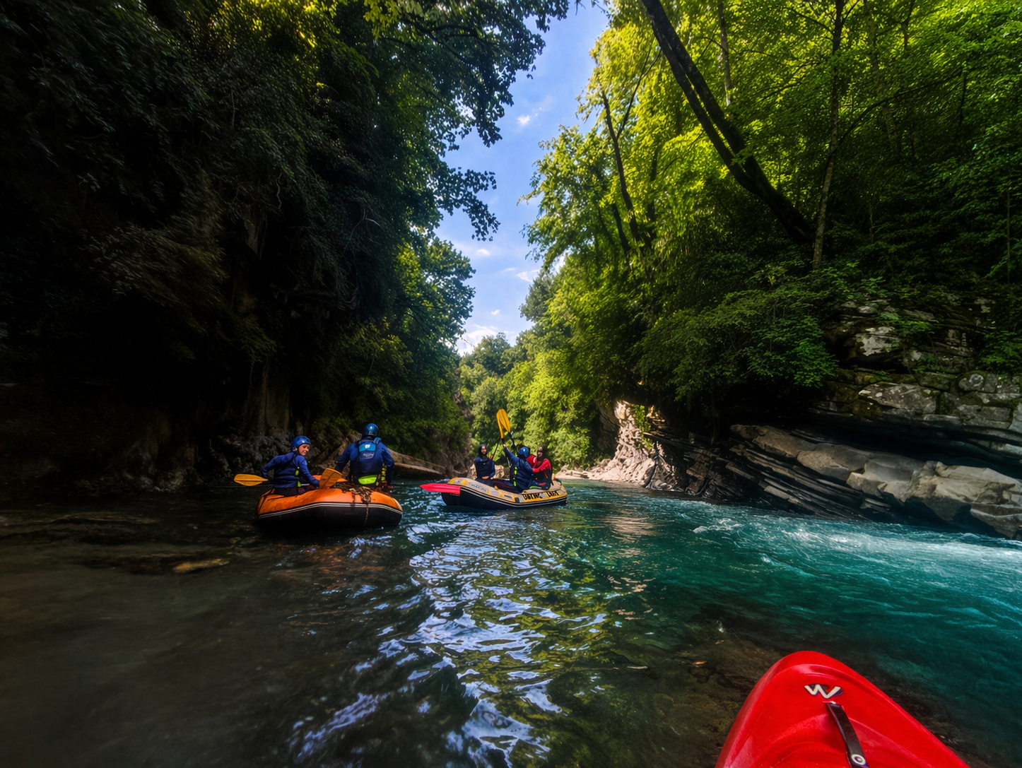 La primera parte del descenso sirve para adaptarse a la dinámica del río. Aprenderéis a seguir las órdenes del guía mientras comenzáis a afrontar rápidos de dificultad moderada, donde el agua serpentea entre las rocas y pone a prueba la coordinación del equipo.